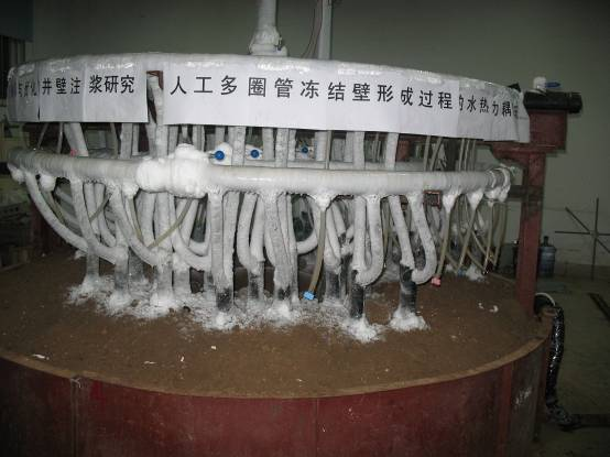 学生根据现场工程实践条件,设置模型相似比,进行矿井冻结模型实验,通过实验获得冻结过程中的温度场、水分场和冻胀应力场。